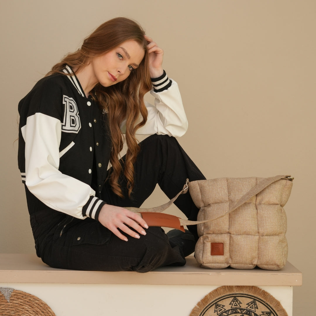 - Secure full-zip closure in the same color, complemented by a jacquard handle with a standard height of 40 cm from the bag’s body. It also features a leather-padded shoulder strap for maximum comfort.